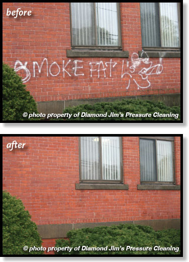 After 30 years in the Pressure Cleaning industry, we have experience removing graffiti from all surfaces and substrates. We can remove graffiti from brick, stone, stucco, painted surfaces, wood, metal, vinyl siding, aluminum siding, glass, perspex, signs, canvass, asphalt and more.